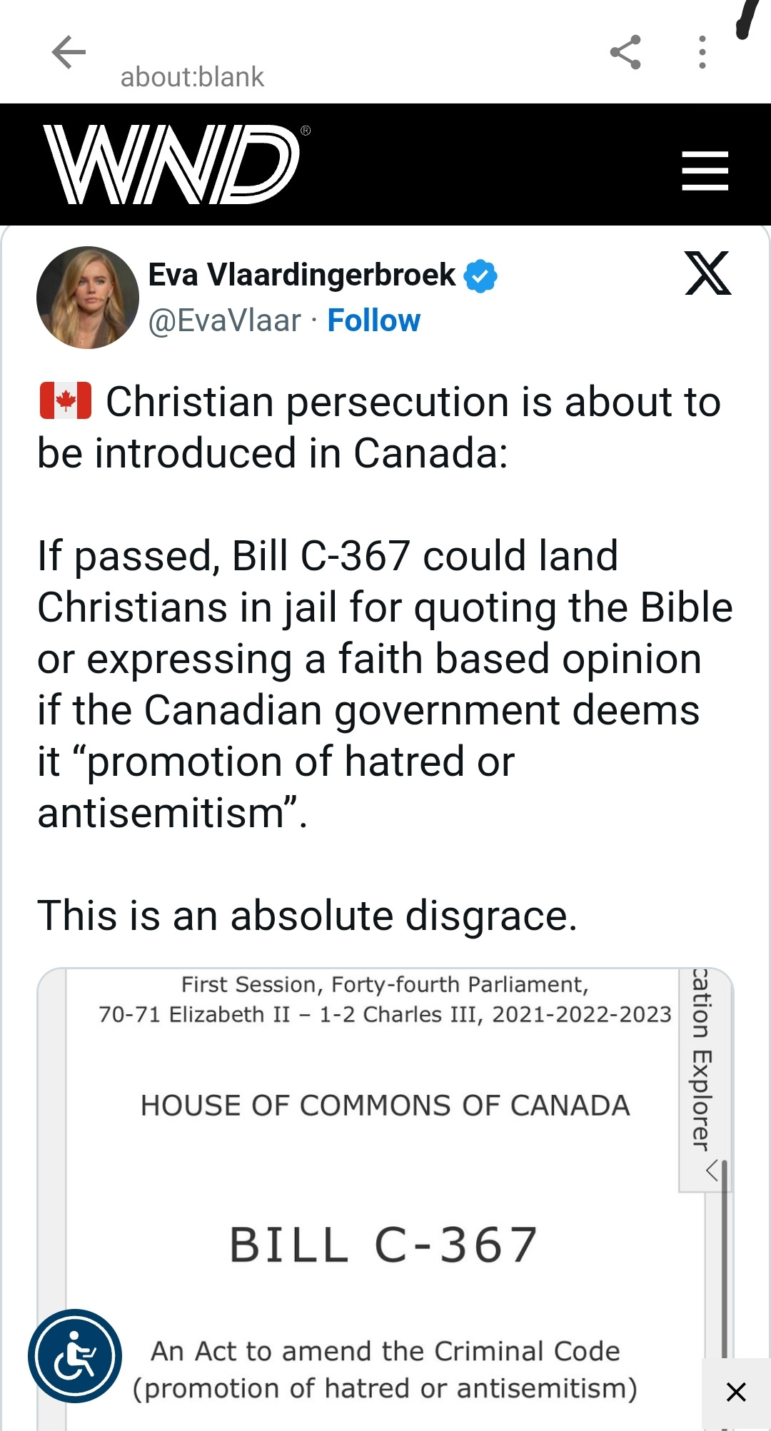 “ Christian persecution is about to be introduced in Canada: If passed, Bill C-367 could land Christians in jail for quoting the Bible or expressing a faith based opinion if the Canadian government deems it “promotion of hatred or antisemitism”. This is an absolute disgrace.”